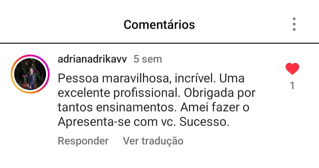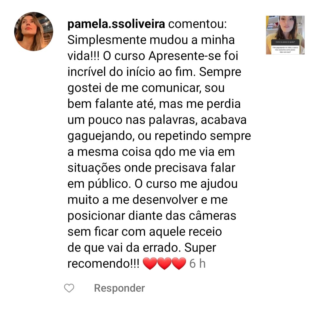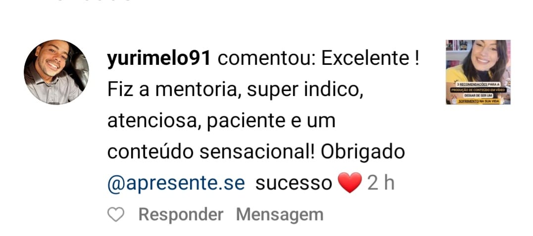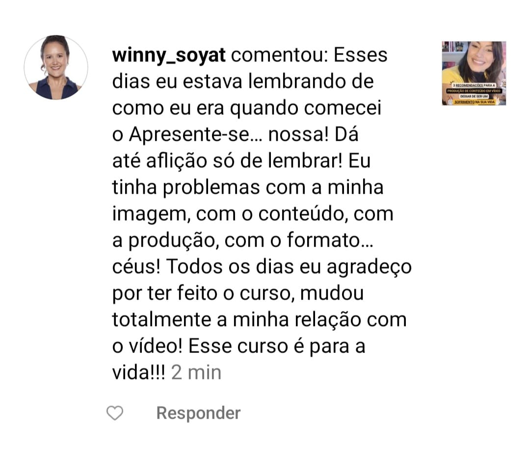Minha mentoria individual é a maneira mais rápida e direcionada de elevar suas habilidades de comunicação em vídeo. Construo uma abordagem personalizada para garantir que cada sessão seja focada nas suas metas específicas, acelerando seu progresso e permitindo que você alcance resultados tangíveis de forma mais eficaz. Eu uso tudo que aprendi durante a minha carreira de jornalista, apresentadora e professora para ajudar você a vencer o medo de gravar vídeos e destravar a sua comunicação.